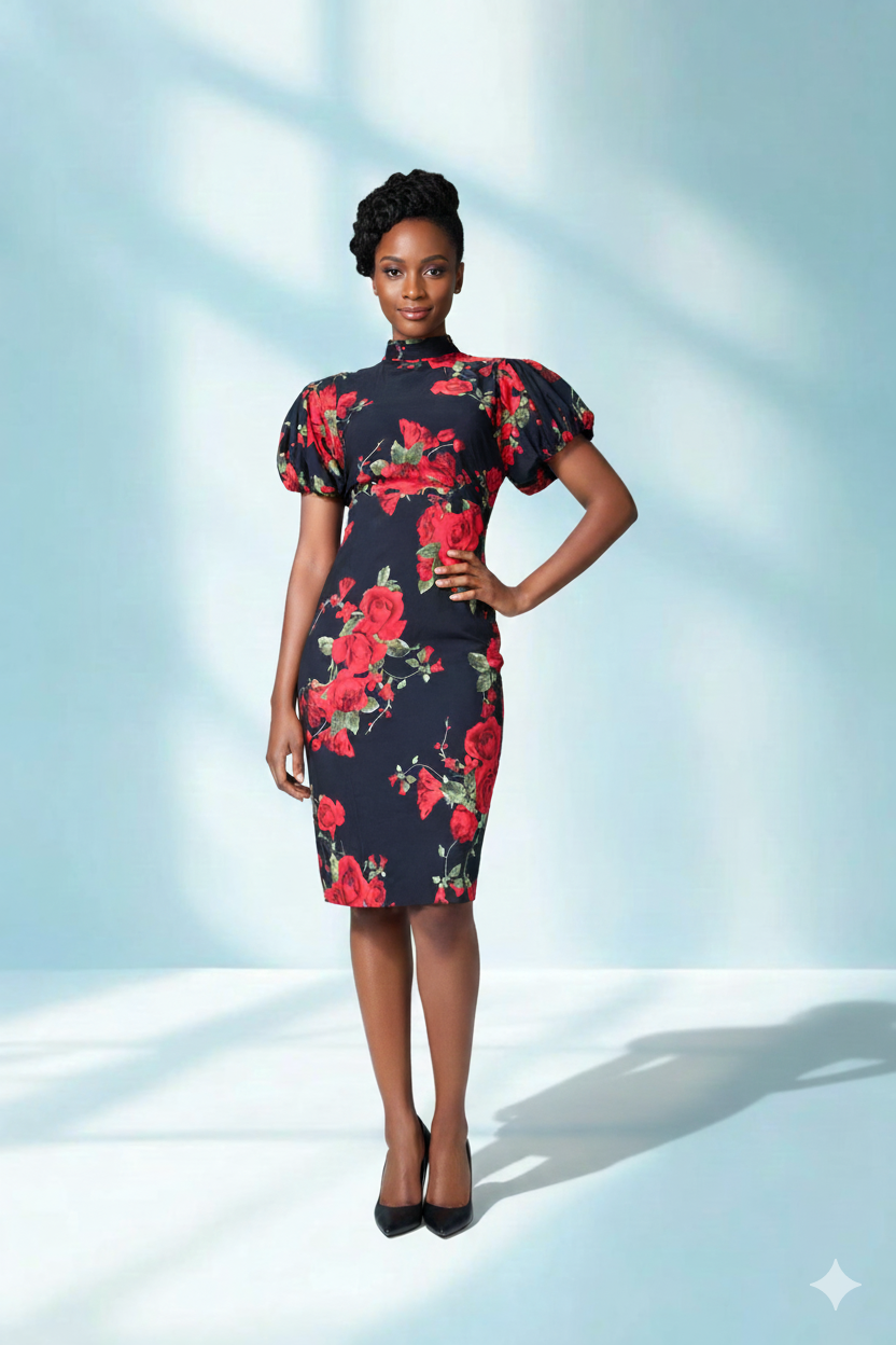 Redefine professional elegance with the Amina sheath, a garment designed for the woman who leads with both strength and grace. This dress combines a traditional high-neck silhouette with a bold, contemporary floral print.