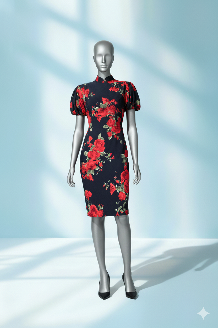 Command the room in this executive style dress featuring a dramatic red rose print on a deep navy canvas.