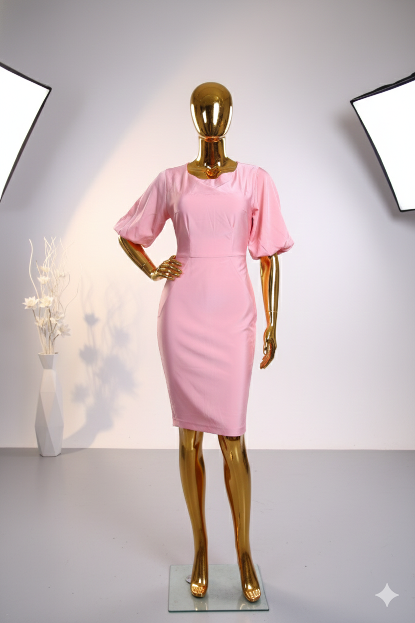 The standout puff sleeves add a touch of romance and luxury, giving the dress a timeless yet contemporary appeal. Its refined knee-length cut makes it versatile for both formal and semi-formal occasions, while the soft blush tone adds a graceful, feminine charm that complements all skin tones.