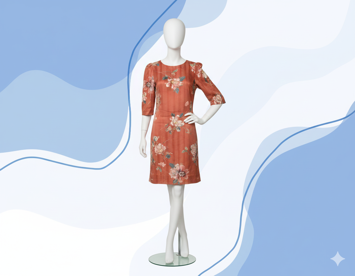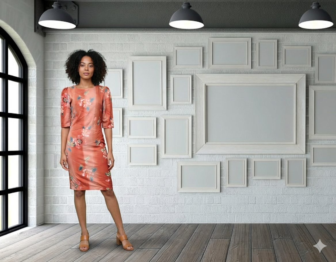 This elegant floral shift dress features a warm rust-toned base adorned with soft floral prints for a timeless and feminine look. Designed with three-quarter sleeves and a flattering fitted silhouette, it offers both comfort and sophistication. The breathable fabric makes it ideal for all-day wear, whether for the office, casual outings, or semi-formal occasions. Easy to style with heels or flats, this versatile dress is a wardrobe essential for the modern woman who values effortless elegance.